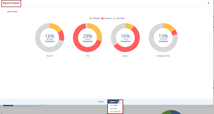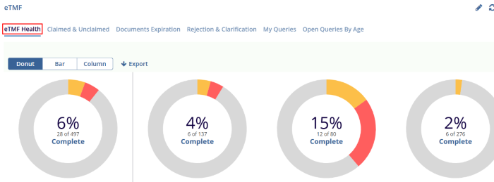 - By default, the eTMF Health tab is selected and the user can view the eTMF Health Chart through the Donut, Bar, and Column view by selecting it.