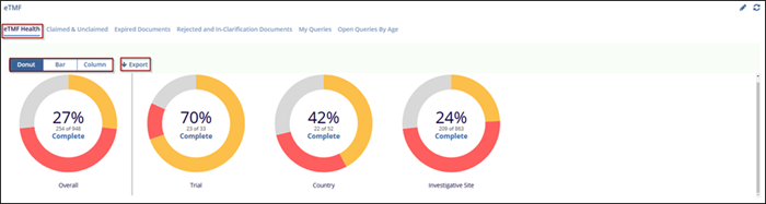- By default, the eTMF Health tab is selected and the user can view the eTMF Health Chart through the Donut, Bar, and Column view by selecting it.