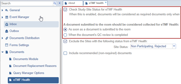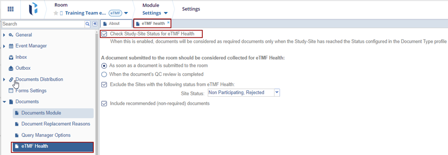The Check Study-Site Status for eTMF Health option can be enabled or disabled here. When enabled, documents will be considered as required documents only when the Study-Site has reached the Status configured in the Document Type profile.