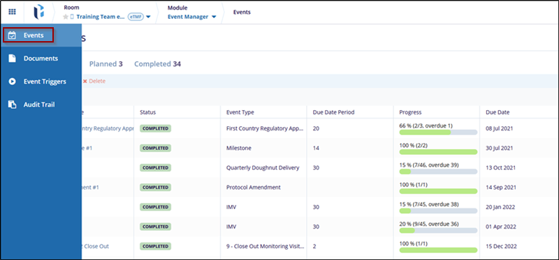 - Completed: This tab displays the completed events, with the event name, event type, completed date etc.