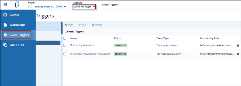 An Event Trigger display folder that carried statuses of each event at the study, country, and site levels.