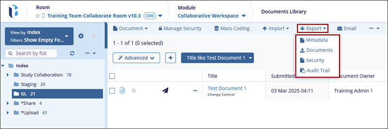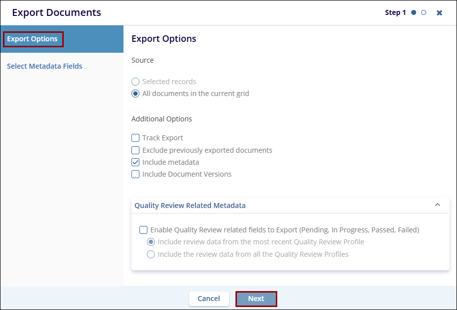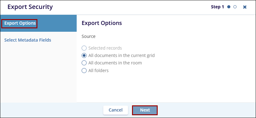The Export function allows users to export either selected or all documents that are currently present in the grid. Like the Import function, this export can export documents, metadata, or both. Users with sufficient access will be able to export security and audit trial information.