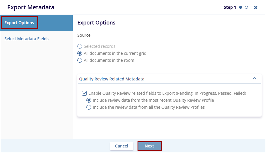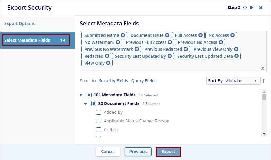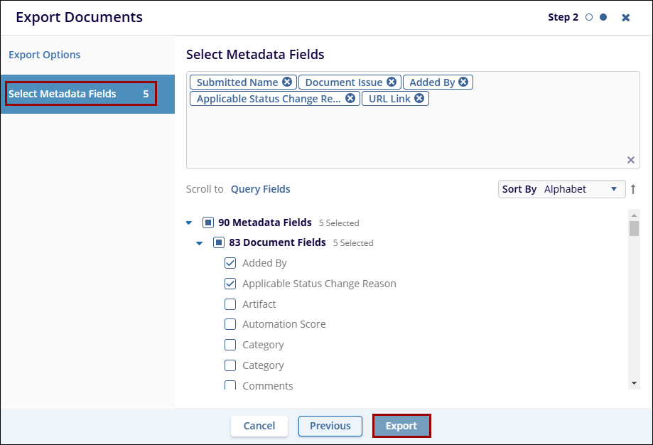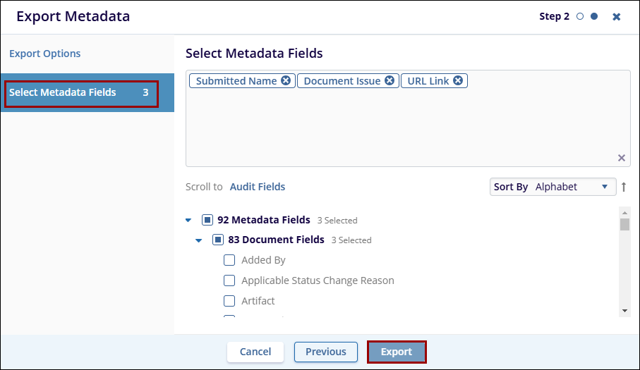 - In Step 2, select the required metadata fields and click on the Export button.