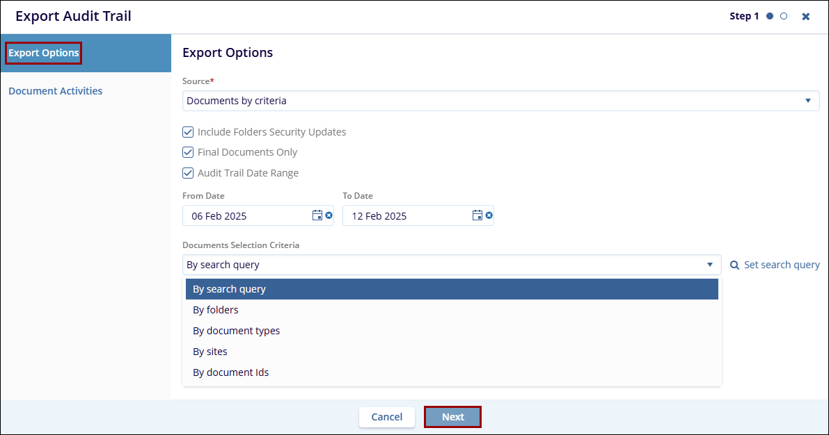 - If Documents by Criteria is selected, specify the Document Selection Criteria by accessing the dropdown options.
