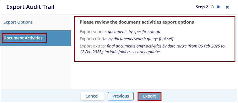 - In Step 2, review the document activities export options and click on the Export