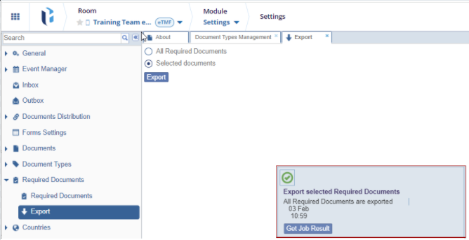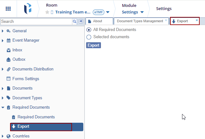 In this menu, Administrator users can export either All Required Documents or Selected documents. Refer to the screenshot below: