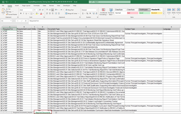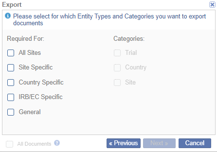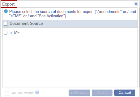 - The Export window opens for you to choose from Amendments, Site Activation Requirements, or eTMF documents. Refer to the screenshot below: