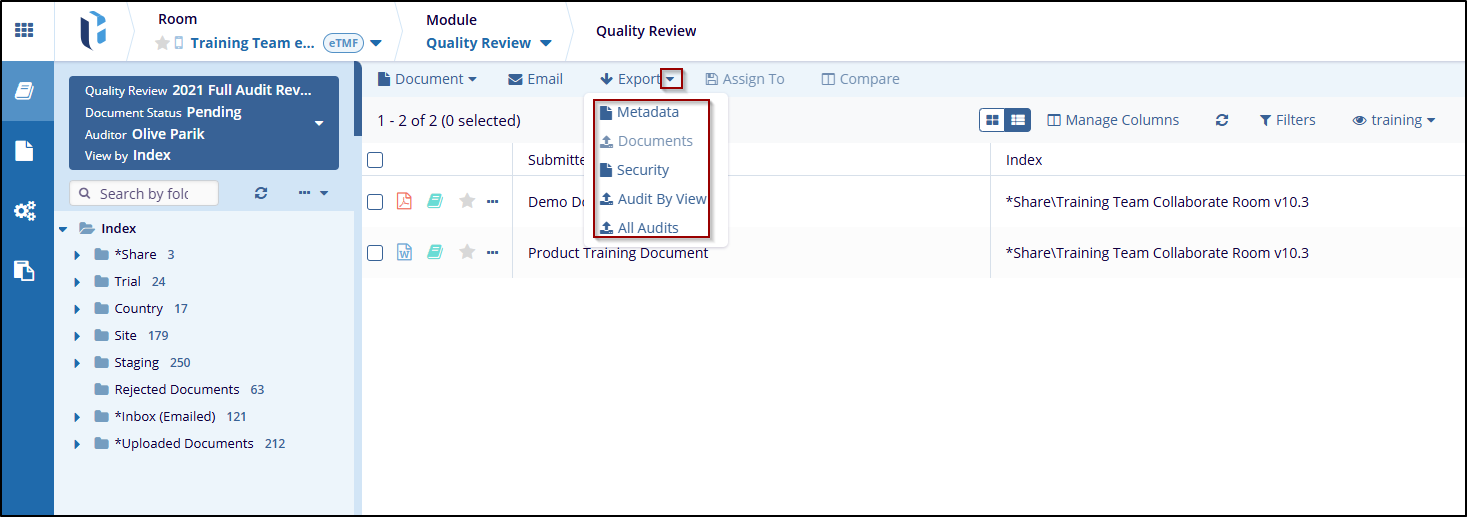 The Export option allows users to export different data types, such as Metadata, Documents, Security, Audit By View, or All Audits.