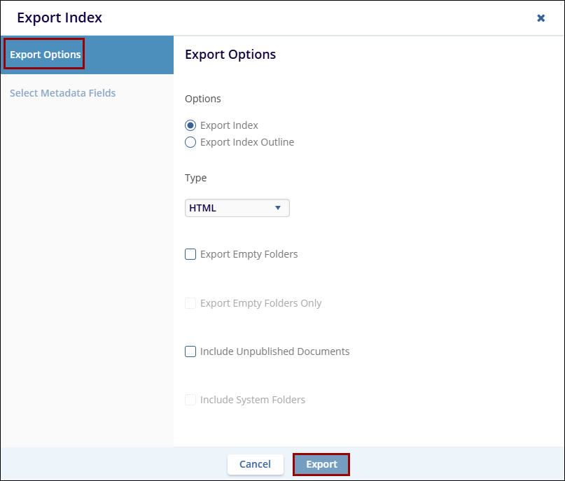 - Select Export Index or Export Index Outline by clicking on the radio buttons.