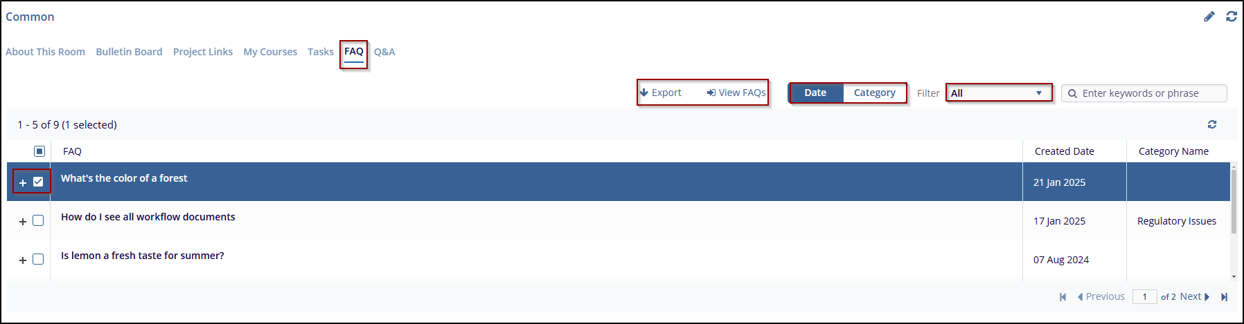 - Click View FAQs and take to the FAQ Module, where the user can filter
