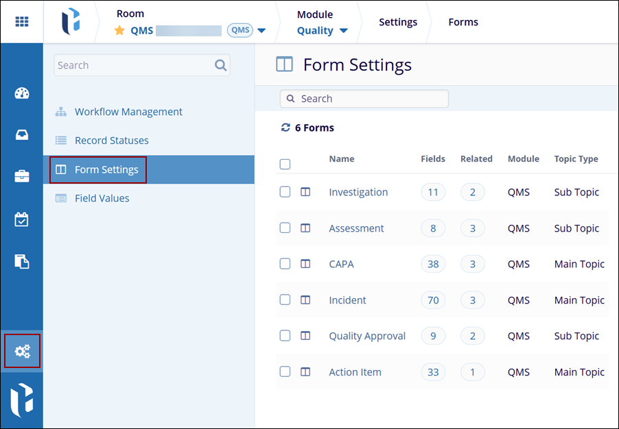 The Form Settings page displays all forms relevant to the Quality module. Users can view and configure these forms, define their relationships as Main Topics or Sub Topics, and manage field-level settings to align forms with organizational requirements.