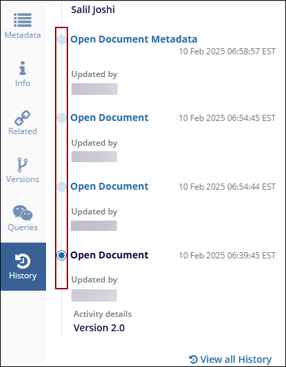 The History tab gives an overview of the document’s history. The History tab displays the top five entries of the activities performed on the document. Here, users can apply the Activity Type and From & To filters to view the history of a document. Additionally, users can view the entire document history by selecting the View all History option.
