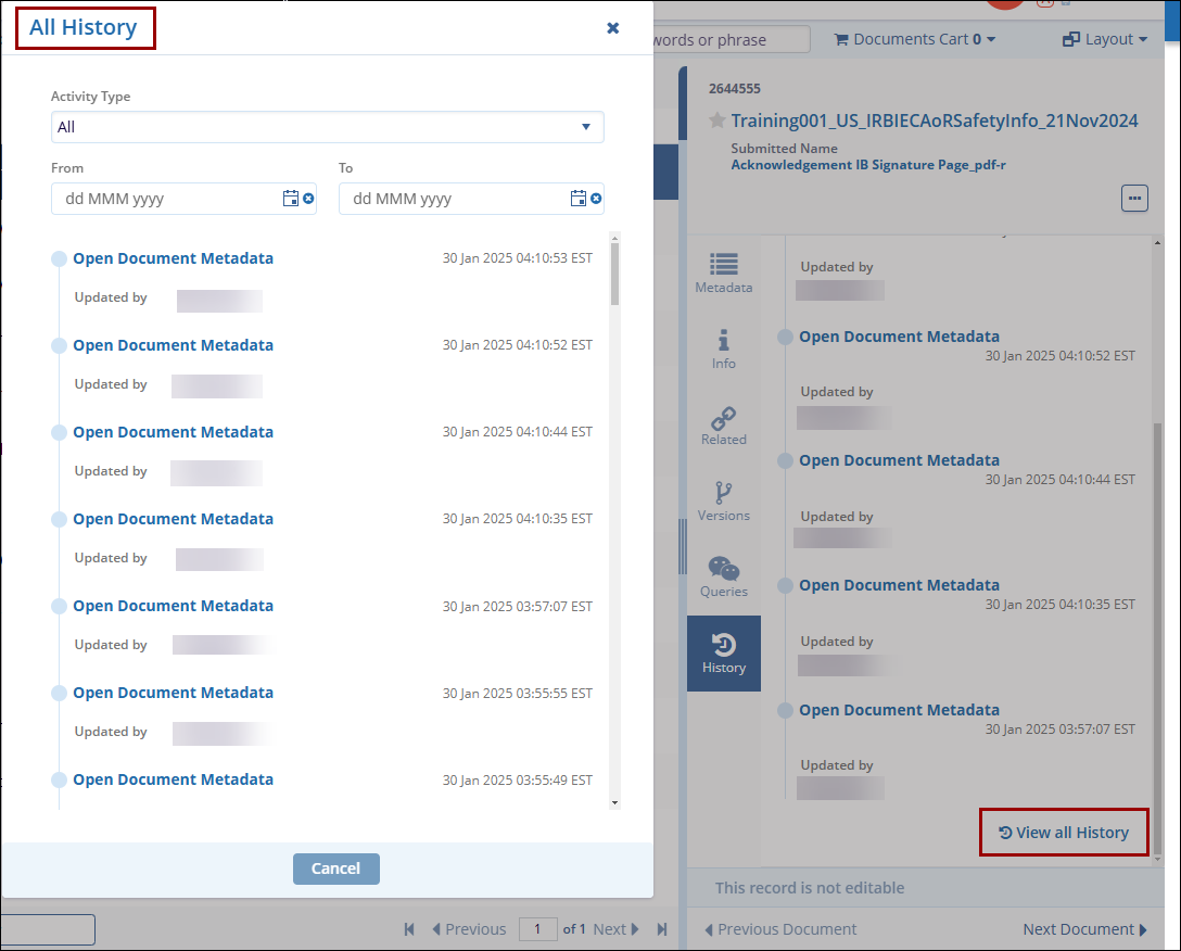 - Activity Type: Use this drop-down to view the document history by the activity performed on it.