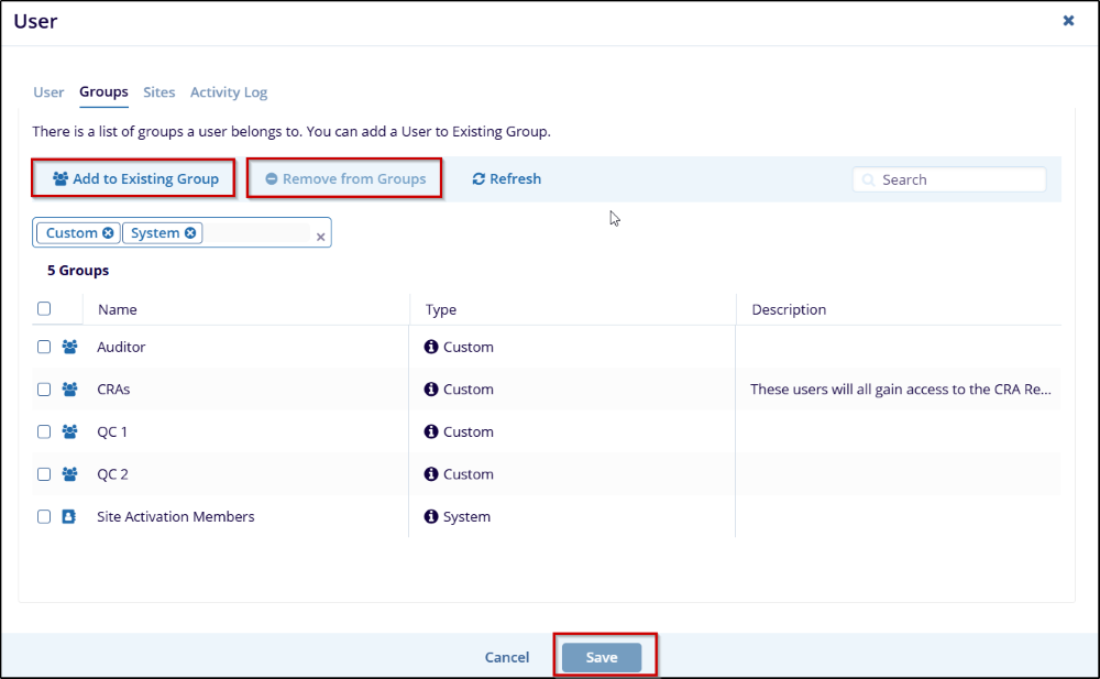 - Add the user to an existing group by selecting the desired group(s) and clicking Add to Existing Group.
