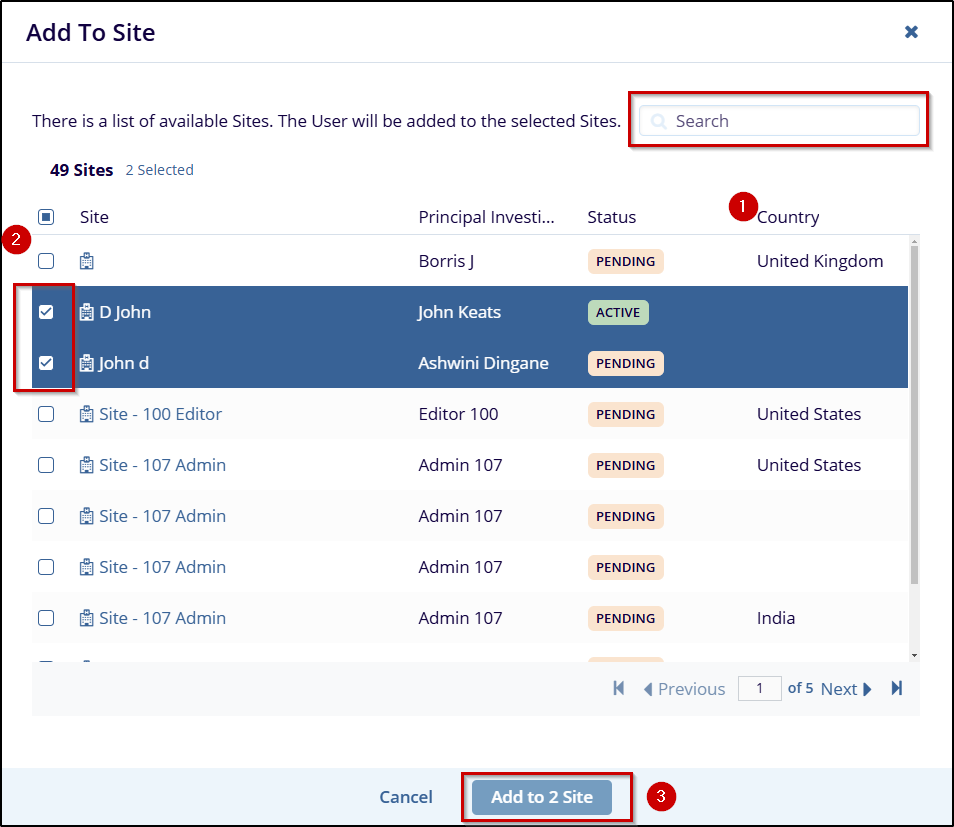 - Select the checkboxes next to the sites you want to add the user to. You can select multiple sites, and the count of selected sites will be displayed.