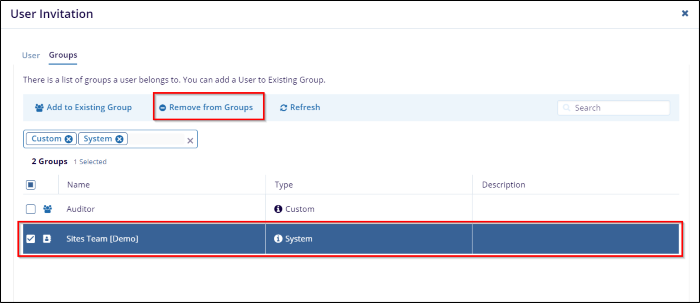 - After assigning the user to the group(s), return to the User Invitation screen and click Save to complete the process.