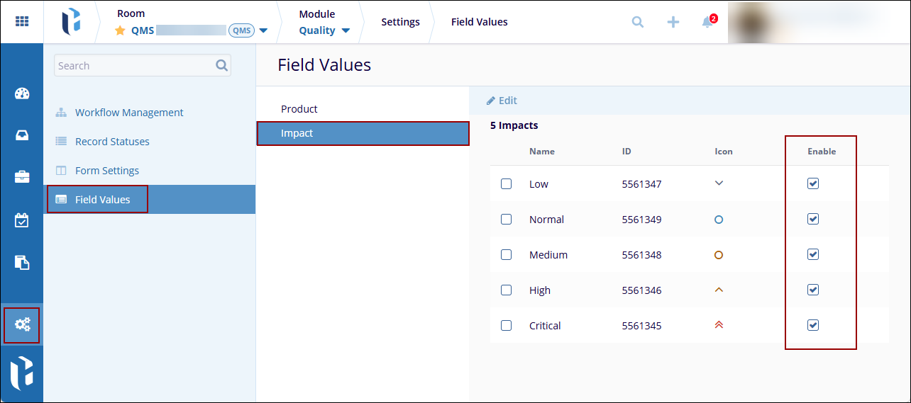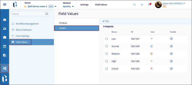 The ‘Impact’ section displays the default out-of-the-box values that can be added in the ‘Impact’ field of the Incident, CAPA, and Action Item forms. Admin users can control the fields visibility and edit the display name.
