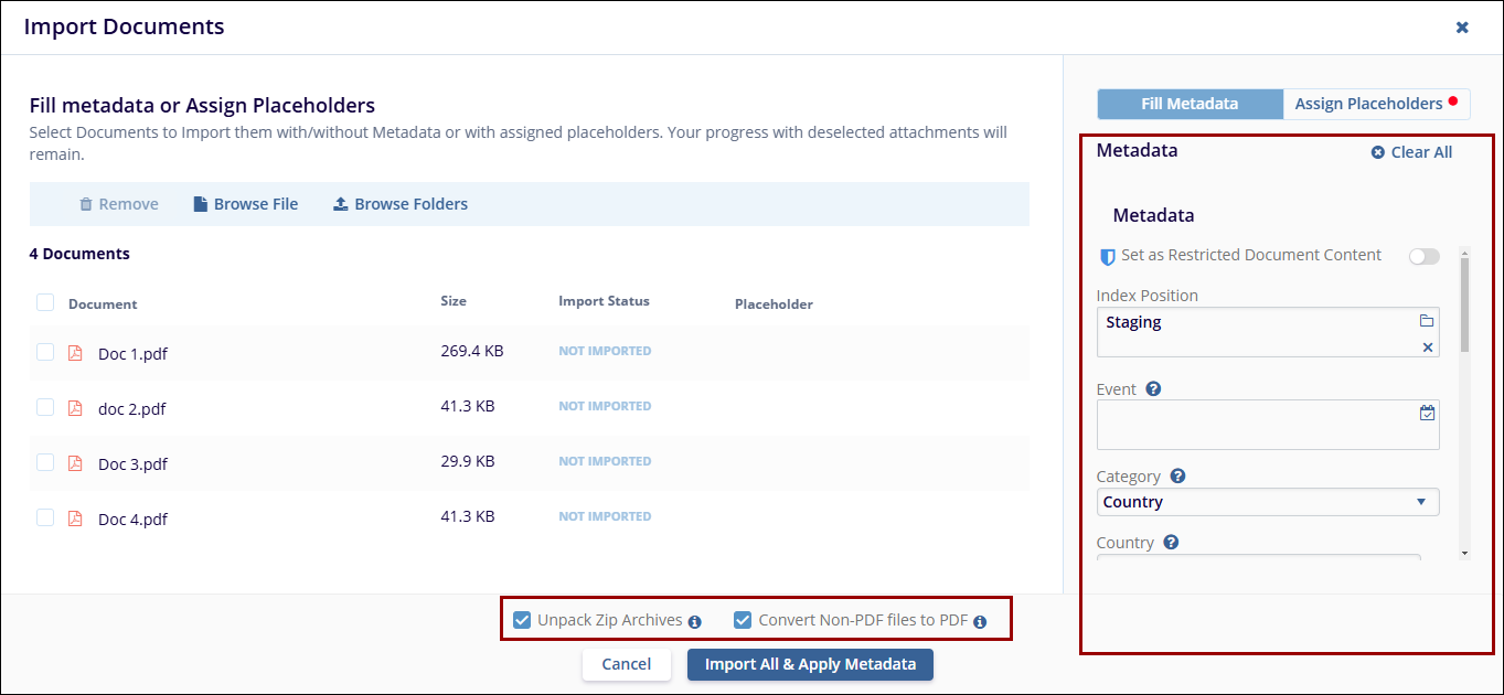 - Unpack Zip Archives: Enable this option if a ZIP folder is uploaded and the documents within the ZIP folder need to be uploaded as separate documents.