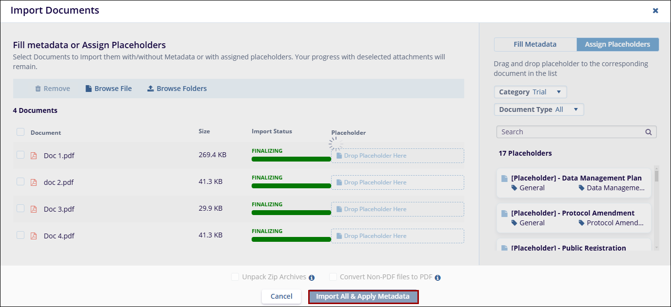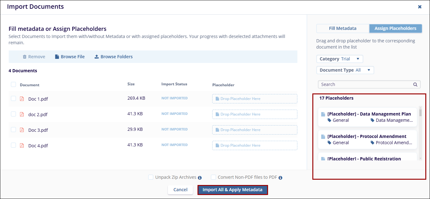 - If metadata fields are not added, navigate to the Assign Placeholders tab and drag & drop the placeholders within the designated area.