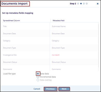 - The system displays a Metadata Fields Mapping screen, ensuring that each column from the uploaded file is correctly mapped to the systems metadata fields.