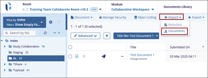 The Import function allows users to add multiple documents into the room, where permissible, the function also allows for the import of metadata.