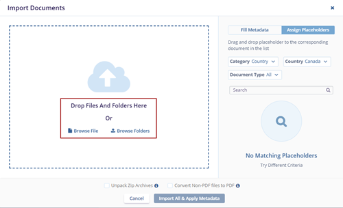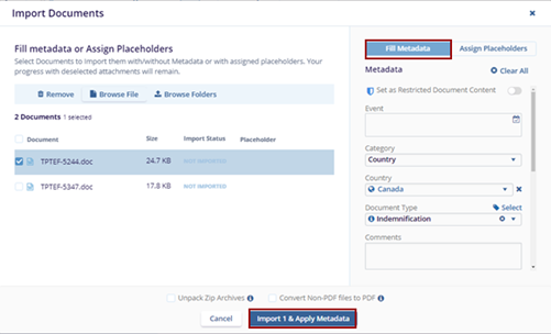 - Click on the Fill Metadata tab where the Country, Category, and Document Type fields are by default selected.