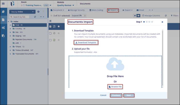 - In the Document Imports window, click on Download Template to get a pre-formatted file that contains the required metadata fields.