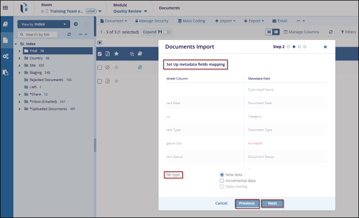 - The system will present a metadata field mapping screen, ensuring that each column from the uploaded file is correctly mapped to the system's metadata fields.