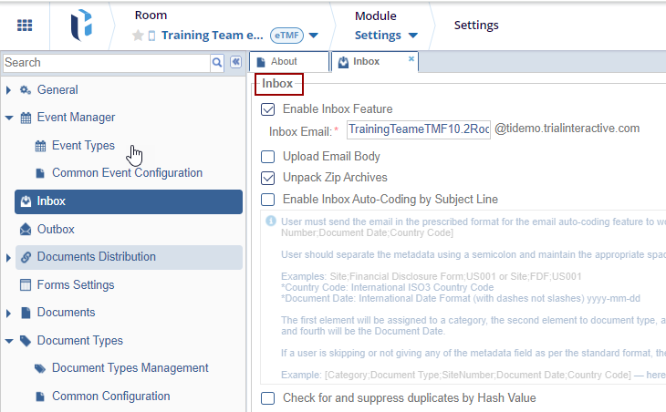 - The "Enable Inbox Auto Coding by Subject Line" option allows users to send emails to the room with subject lines formatted according to specific guidelines, ensuring that the received documents are automatically tagged with the appropriate metadata.