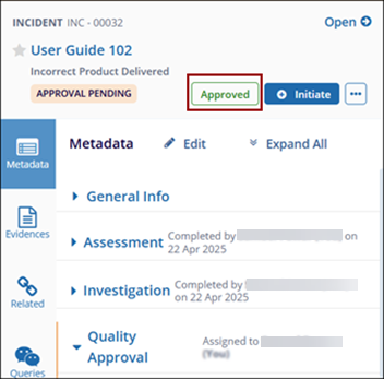 - From the grid, select the incident to view its metadata panel. The incident is in the Approval Pending Stage.