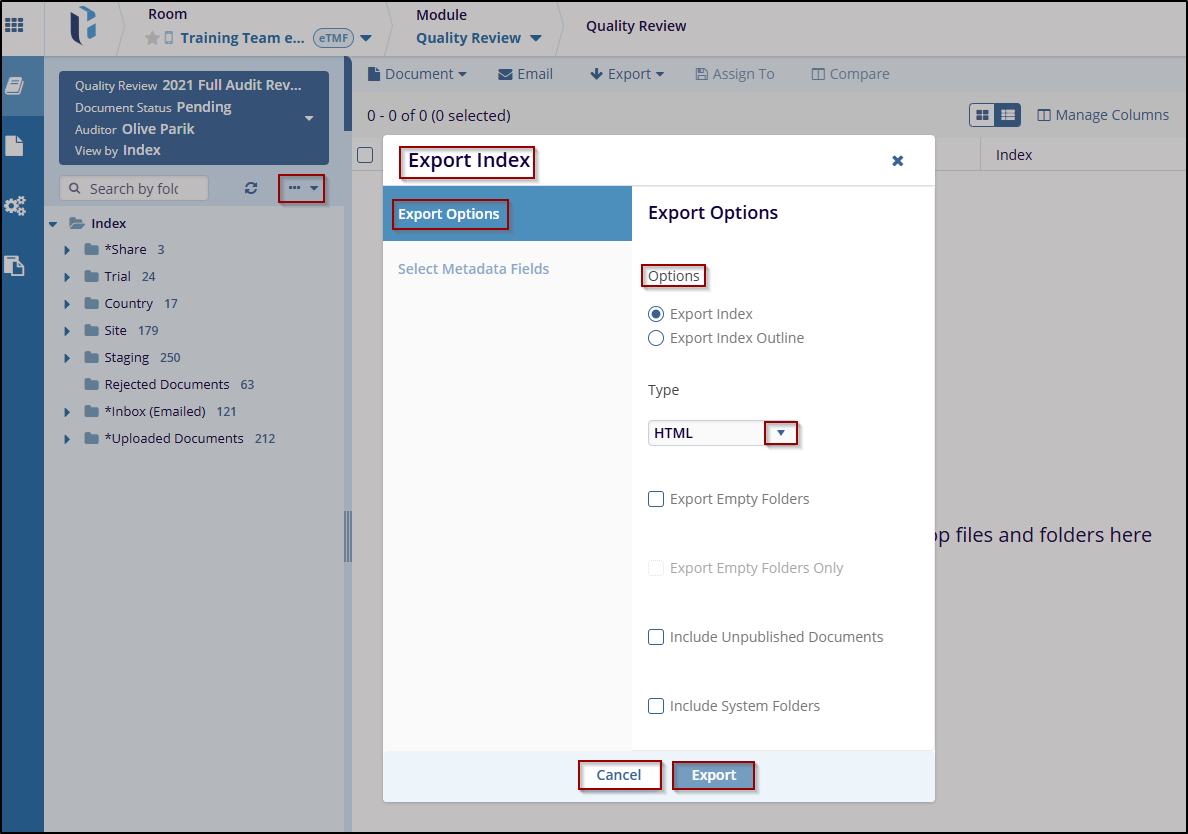 - Select the Export Index from the Index dropdown to open a new window with available options Export Options and Select Metadata Fields.
