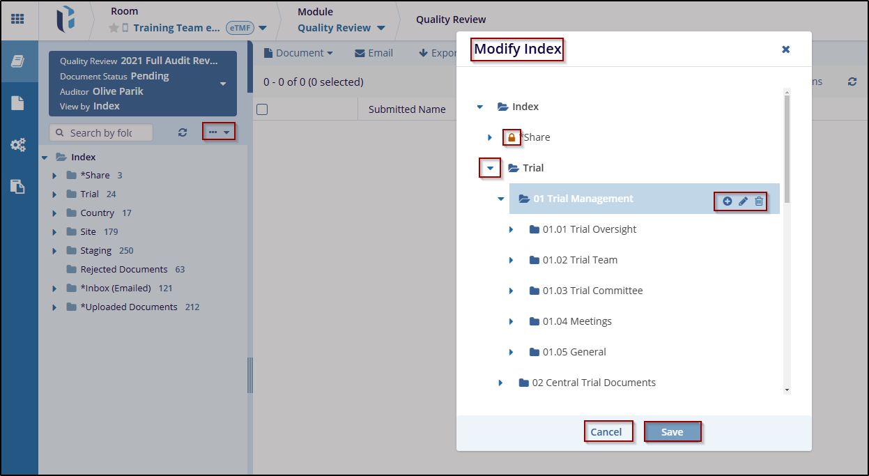- Click on the three-dot menu and select the Modify Index option from the dropdown options, a new window will open, where the user can see folders have lock icons that are restricted folders that cannot be edited, and some are not locked folders that can be edited by selecting the Pencil icon.