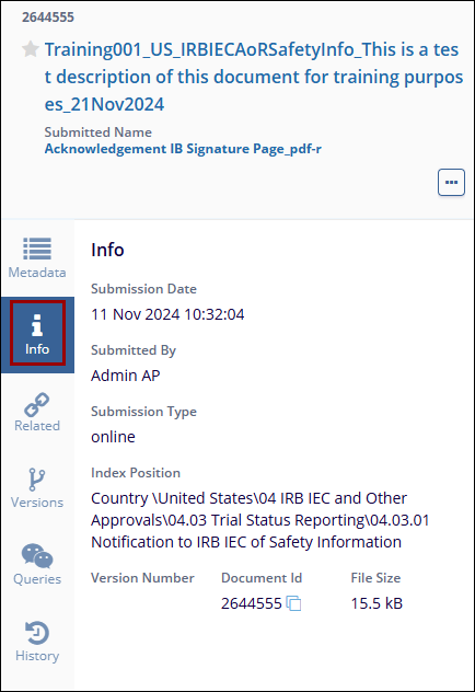 The Info tab within the Metadata panel of a document provides a comprehensive overview of key document details. This tab includes essential document information that helps users track document details. The information includes the following.