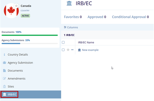 The IRB/EC tab in the Country module lists all IRBs/ECs associated with a specific country. Users can edit, manage columns, search, manage, and create filters on this page. The grid pane displays key details, including IRB/EC Name, Status, Progress, and Address. Refer to the screenshot below for reference.