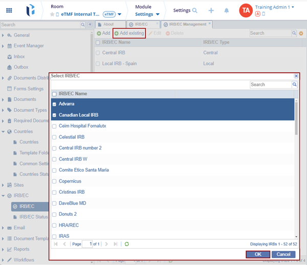 The additional IRB/EC organizations can be added, edited, or deleted as needed from this menu.