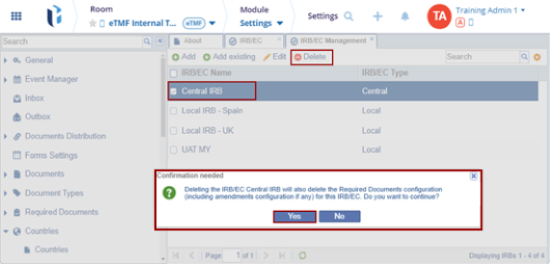 - Locate the IRB/EC Name and click the Delete button, the selected IRB/EC gets deleted.