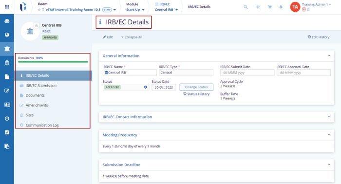 • Expand All – Expands the sections for General Information, IRB/EC Contact Information, Meeting Frequency, and Submission Deadline.