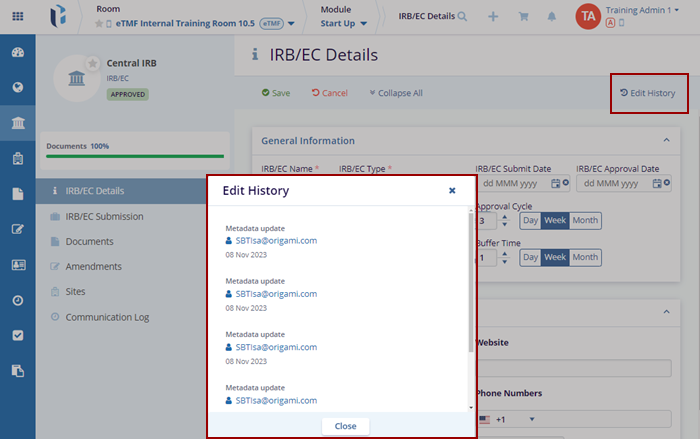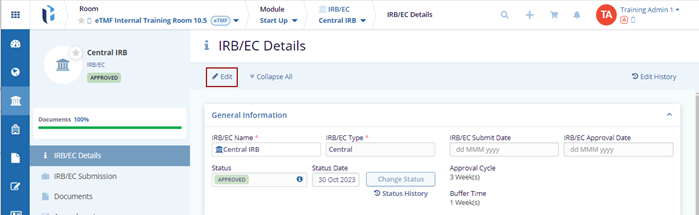 • Edit - Edit fields in General Information, IRB/EC Contact Information, Meeting Frequency, and Submission Deadline for the IRB/EC.
