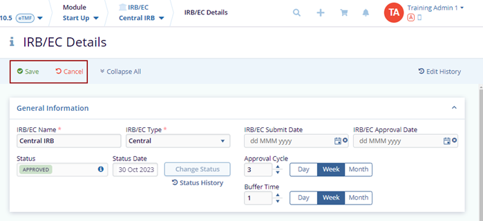 6. Click the Save button on the top of the menu bar on the IRB/EC Details page.