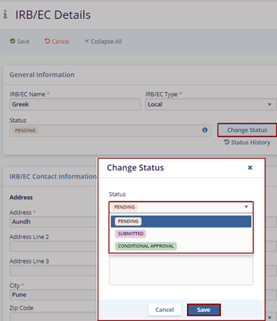 1. Click the Change Status button displayed on the IRB/EC Details page. This opens the Change Status popup window.