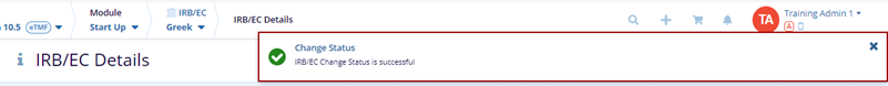 5. The notification message is displayed as ‘IRB/EC Change Status is successful’.