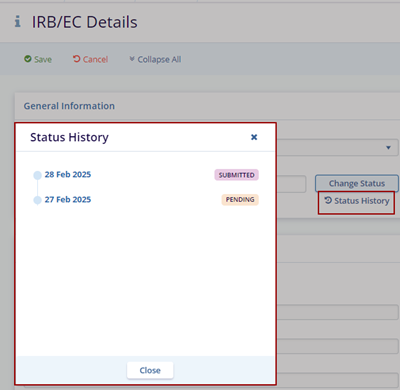 A Status History button is displayed below the Change Status button. Click the button to view the name of the user who made the changes on the IRB/EC Details page.