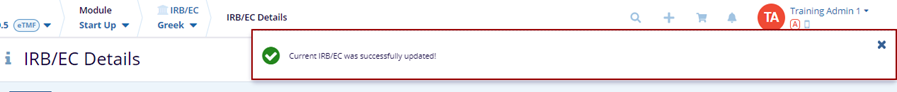 The notification message is displayed as ‘Current IRB/EC was successfully updated!’.