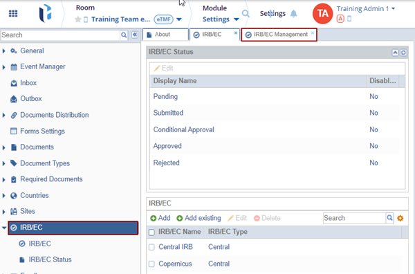 The IRB/EC displays 2 categories IRB/EC Status and IRB/EC.
