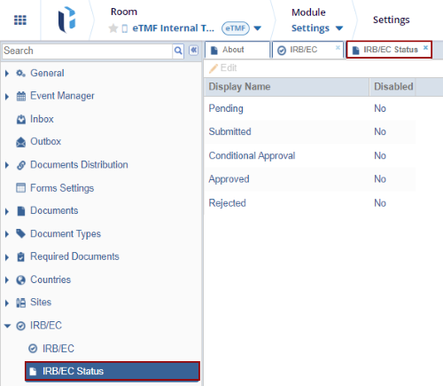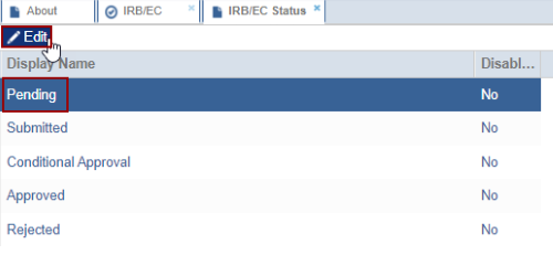 - Select the Display Name in the IRB/EC Status and click the Edit