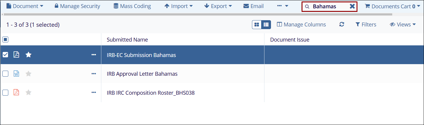 Above the documents grid, next to the documents cart, is a search bar. This is a local search and will search the currently selected index folder for relevant documents.