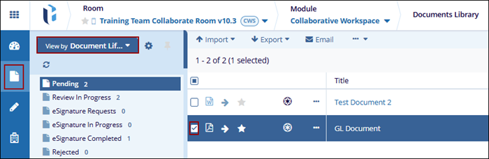 - Navigate to the Documents Library modal, and set the view to Document Life Cycle.