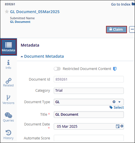 - Navigate to the metadata panel of the document and click on the Claim