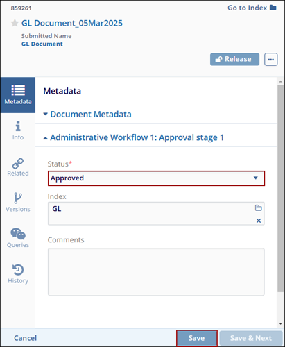 - Click on the Save button so that the document moves to the next stage of approval or
