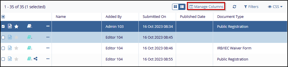 - Click the Manage Columns button from the top-right corner of the documents grid.
